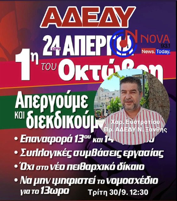 Η Ε.Γ. του Ν.Τ. της Α.Δ.Ε.Δ.Υ. Ξάνθης καλεί τους εργαζόμενους στο Δημόσιο, που απασχολούνται με οποιαδήποτε μορφή εργασίας, να συμμετάσχουν στην 24ωρη Πανελλαδική Πανδημοσιοϋπαλληλική Απεργία που προκήρυξε η Εκτελεστική Επιτροπή της Α.Δ.Ε.Δ.Υ. την Τετάρτη 1η Οκτωβρίου 2025
