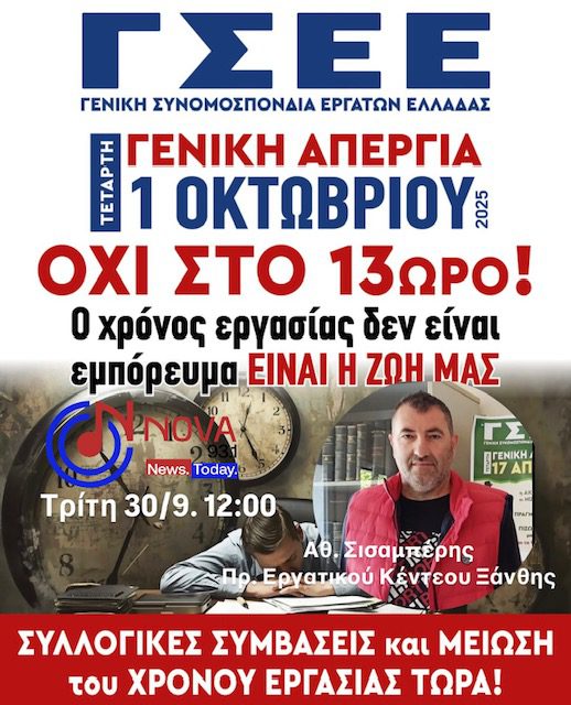 24ωρη Πανελλαδική Απεργία την Τετάρτη 1η Οκτωβρίου. Η συγκένρωση θα γίνει έξω απο Εργατικό Κέντρο Ξάνθης, στην πλατεία Ελευθερίας στις 10:30.