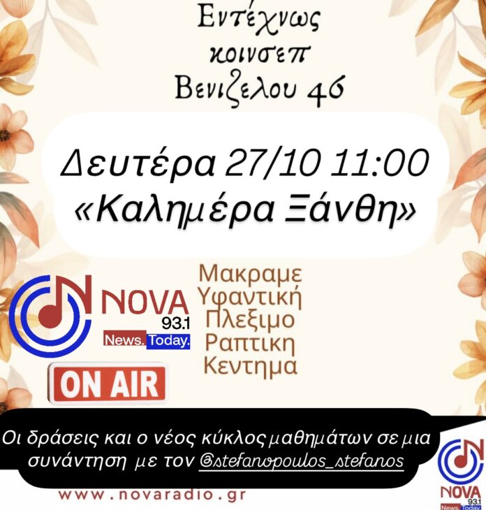 Η Κοιν.Σ.Επ Εντέχνως στον Νοvα 93,1.Προκειται για μία κοινωνική Συνεταιριστική Επιχείρηση που συστάθηκε από πέντε κυρίες, οι οποίες ασχολούνται με την Κεραμική, την Υφαντική, το Σύγχρονο κόσμημα και το Μακραμέ.Στον χώρο τους μπορείτε να βρείτε τις δημιουργίες καθώς λειτουργεί Εκθετήριο – πωλητήριο και Εργαστήριο όπου παραδίδονται μαθήματα!