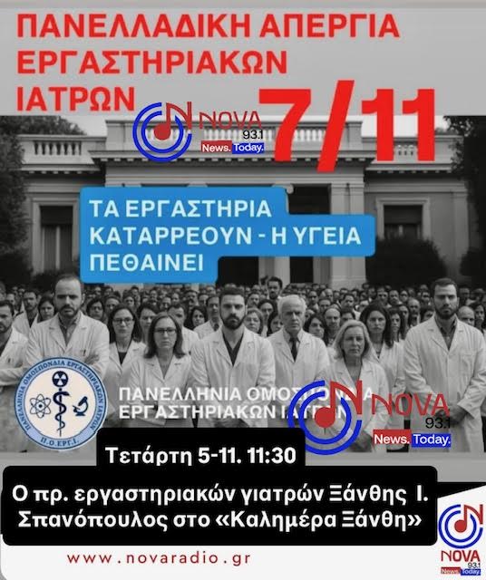 Ο πρόεδρος των εργαστηριακών γιατρών Ξάνθη Ιωάννης Σπανόπουλος στο «Καλημέρα Ξάνθη» Για την απεργία στις 7 Νοεμβρίου ενάντια στην κατάργηση των άδειων εργαστηριακών γιατρών, υπέρ της προστασίας της ποιότητας των υπηρεσιών υγείας, με κριτική στην κυβερνητική πολιτική υγείας. Πανελλήνια Ομοσπονδία Εργαστηριακών Ιατρών (ΠΟΕΓΙ)