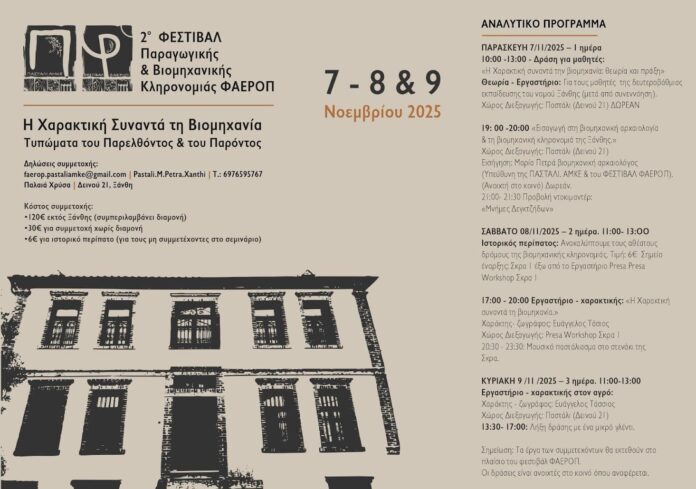 Η Χαρακτική Συναντά τη Βιομηχανία – Τυπώματα του Παρελθόντος και του Παρόντος Το μοναδικό εκπαιδευτικό βιωματικό εργοταξιακό σεμινάριο για τη βιομηχανική αρχαιολογία, στο πλαίσιο του 2ου ΦΕΣΤΙΒΑΛ ΦΑΕΡΟΠ, συνεχίζει τον δεύτερο κύκλο του το 2025, ακόμη πιο «βιομηχανικά»! Τόπος διεξαγωγής: ΠΑΣΤΑΛΙ – Ξάνθη- Pressa Workshop –Εργαστήρι Χαρακτικής. (ΣΚΡΑ Δηλώσεις συμμετοχής: faerop.pastaliamke@gmail.com Πληροφορίες: 6976595767
