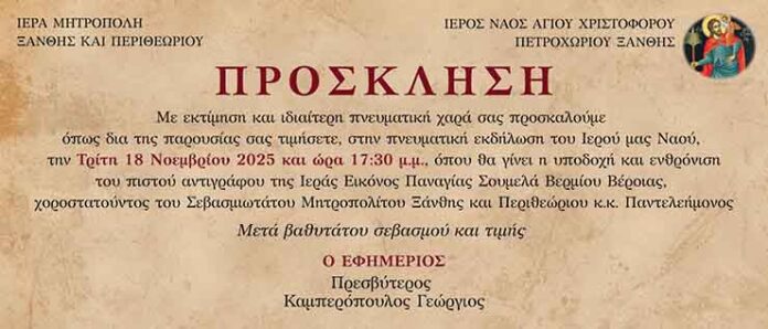 Πρόκειται για ένα σημαντικό εκκλησιαστικό και πολιτιστικό γεγονός για την τοπική κοινωνία· αναμένεται να συγκεντρωθεί πλήθος προσκυνητών από την Ξάνθη και την ευρύτερη περιοχή της Θράκης.Από την Καστανιά Βερμίου, ένα πιστό αντίγραφο στο Πετροχώρι Ξάνθης. Με προσμονή αναμένει η τοπική Εκκλησία την άφιξη της εικόνας των Ποντίων, της Παναγίας Σουμελά, την Τρίτη 18 Νοεμβρίου, στις 17:30.Ο Εφημέριος Πρεσβύτερος Καμπερόπουλος Γεώργιος μίλησε στον Nova 93,1