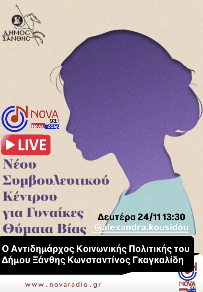 Εγκαινιάζεται το Συμβουλευτικό Κέντρο «Ζωή Δαλακλίδου» για γυναίκες θύματα βίας στην Ξάνθη.Ο Αντιδήμαρχος Κοινωνικής Πρόνοιας Ξάνθης Κωνσταντίνος Γκαγκαλίδης μίλησε στον Nova 93,1 για “Ένα νέο μοντέλο κοινωνικής φροντίδας στον Δήμο Ξάνθης, με έργα που αλλάζουν την καθημερινότητα.Στο πλαίσιο εκδηλώσεων για τον εορτασμό της Παγκόσμιας Ημέρας Εξάλειψης Βίας, ο Δήμος Ξάνθης εγκαινιάζει την Τρίτη 25 Νοεμβρίου 2025 στις 12μ., τη λειτουργία του Συμβουλευτικού Κέντρου Υποστήριξης Γυναικών θυμάτων Βίας «Ζωή Δαλακλίδου».Η τελετή θα λάβει χώρα στο χώρο του Κέντρου (αυλή πρώην Ορφανοτροφείου Θηλέων – Βενιζέλου 30).