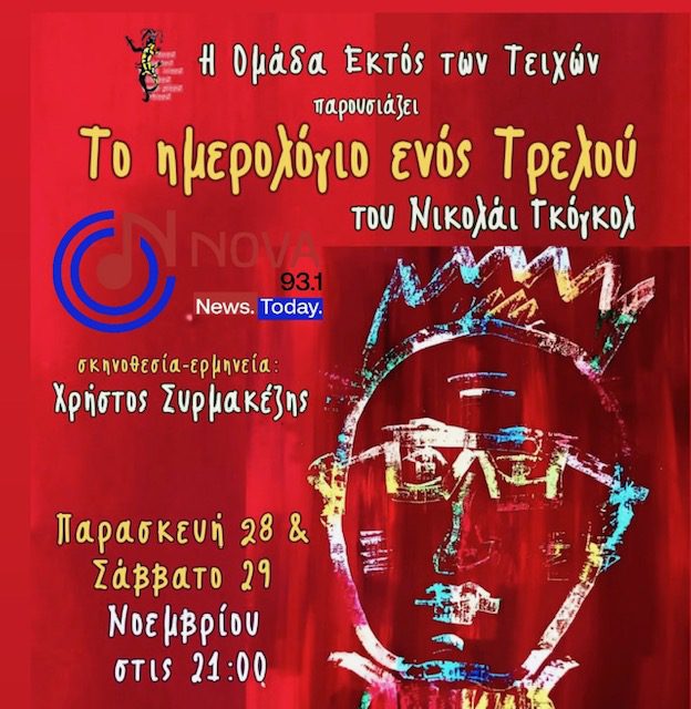 Η Ομάδα Εκτός των Τειχών παρουσιάζει το μοναδικής ψυχολογικής ακριβείας έργο του Νικολάι Γκόγκολ “Το ημερολόγιο ενός τρελού“. Το “Ημερολόγιο”, γραμμένο το 1835, αποτελεί ένα σχεδόν αυτοβιογραφικό κείμενο. Ο ίδιος ο Γκόγκολ είχε προβλήματα με την ψυχική του υγεία.Kαλεσμενος στον Nova 93,1 ο σκηνοθέτης και ηθοποιός Χρήστος Συρμακέζης,και η κα Μ.Πετρά υπεύθυνη της αστικής ΠΑΣΤΑΛΙ ΑΜΚΕ,σε μία συζήτηση που αφορμή την παράσταση που θα πραγματοποιηθει την Παρασκευή 28 και Σάββατο 29 Νοεμβρίου στις 21.00 στη Παλαιά Χρύσα, Δεινού 33,Ξάνθη.