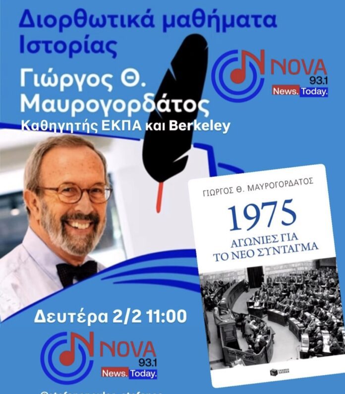 Με ιδιαίτερη χαρά φιλοξενούμε έναν αγαπημένο συγγραφέα, τον καθηγητή Γιώργο Μαυρογορδάτο, ο οποίος δίδαξε πολιτική ιστορία και πολιτική επιστήμη στο Πανεπιστήμιο Αθηνών και σε ξένα πανεπιστήμια. Είναι συγγραφέας βιβλίων που θα τα χαρακτήριζα σταθμούς της ελληνικής πολιτικής ιστορίας και δημιουργός της podcast σειράς «Διορθωτικά μαθήματα ιστορίας». Πρόσφατα κυκλοφόρησε το νέο του πόνημα με τίτλο «1975, Αγωνίες για το νέο Σύνταγμα».